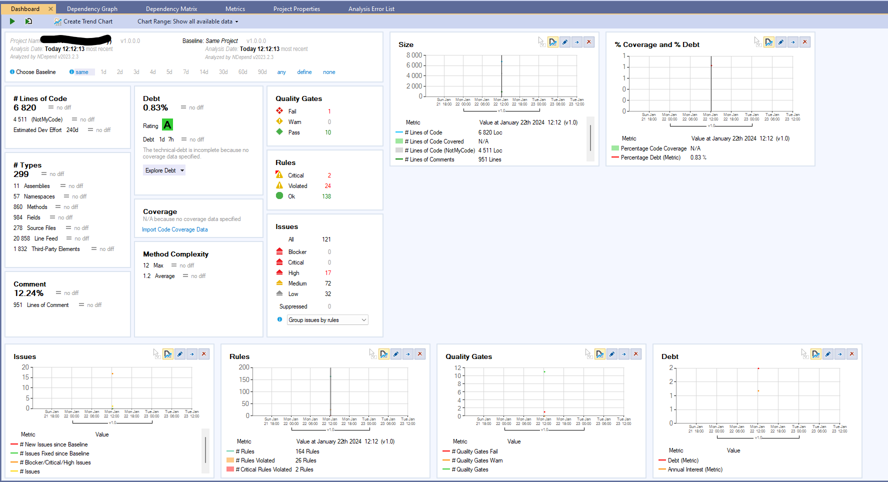 Here lies a general overview of the quality of the whole solution that you have analyzed. This gives a great quick shot of the elements you could get your hand onto if your goal is to refactor the code to make it more maintainable. You can personalize the rules and change them to your likings. For example, in my previous screenshot, there is one critical rule that flags I'm using a type within another type which have both different namespaces. The debt explanation is interesting. Of course, you can always decide to ignore it, but it gives an interesting point of view regarding the fact that some developers are using folders within a project to "organize" classes, which can lead to this kind of rule alert. Of course, everything is to take with a grain of salt, as I agree with someone from the comments of this Stack Overflow thread, these kind of alerts can be opinion based. An interesting thing that NDepend's team could be adding inside their analysis program is rule categorization; Opiniated ones versus the others by example. It could help to quickly address undiscussable items and leave any development team to discuss the other opiniated points and see whether they need to be addressed.