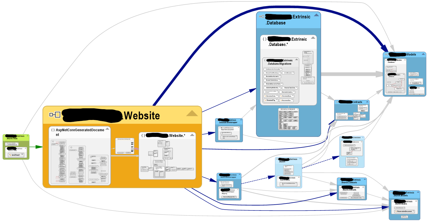 I think the most interesting feature of NDepend is the dependency graph. It's so incredibly useful to quickly identify areas of your code that aren't supposed to inherit another project within your solution. This can otherwise, to my opinion, often lead to solutions having classes/elements heavily coupled/entangled together. Based on the same project that I have used to create my first screenshot, here is an example of the graph: