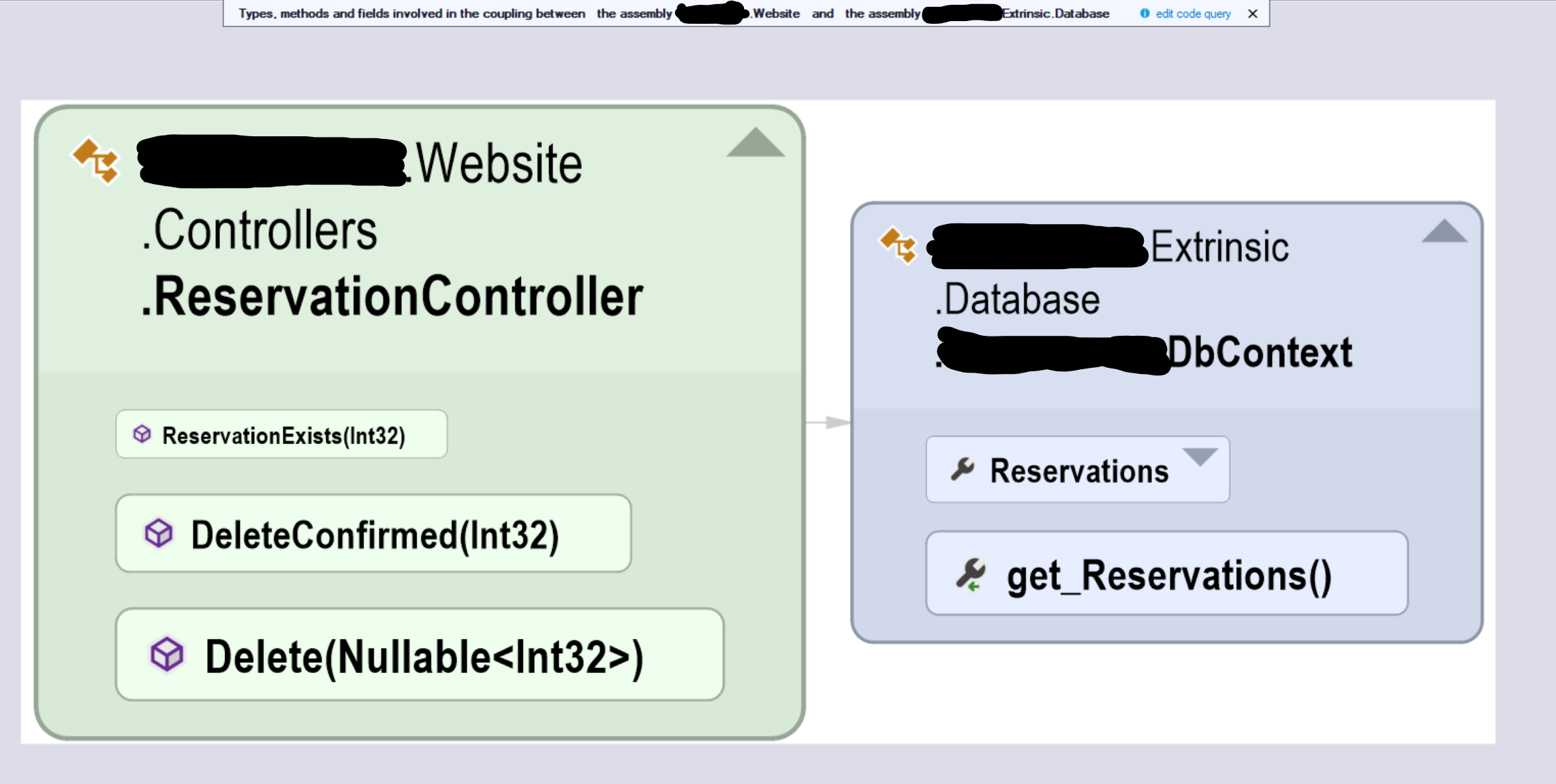 NDepend quickly identified a discrepancy in my project: There is a direct reference from the website to the database library and this is not normal. Double clicking on the arrow gives me the following: